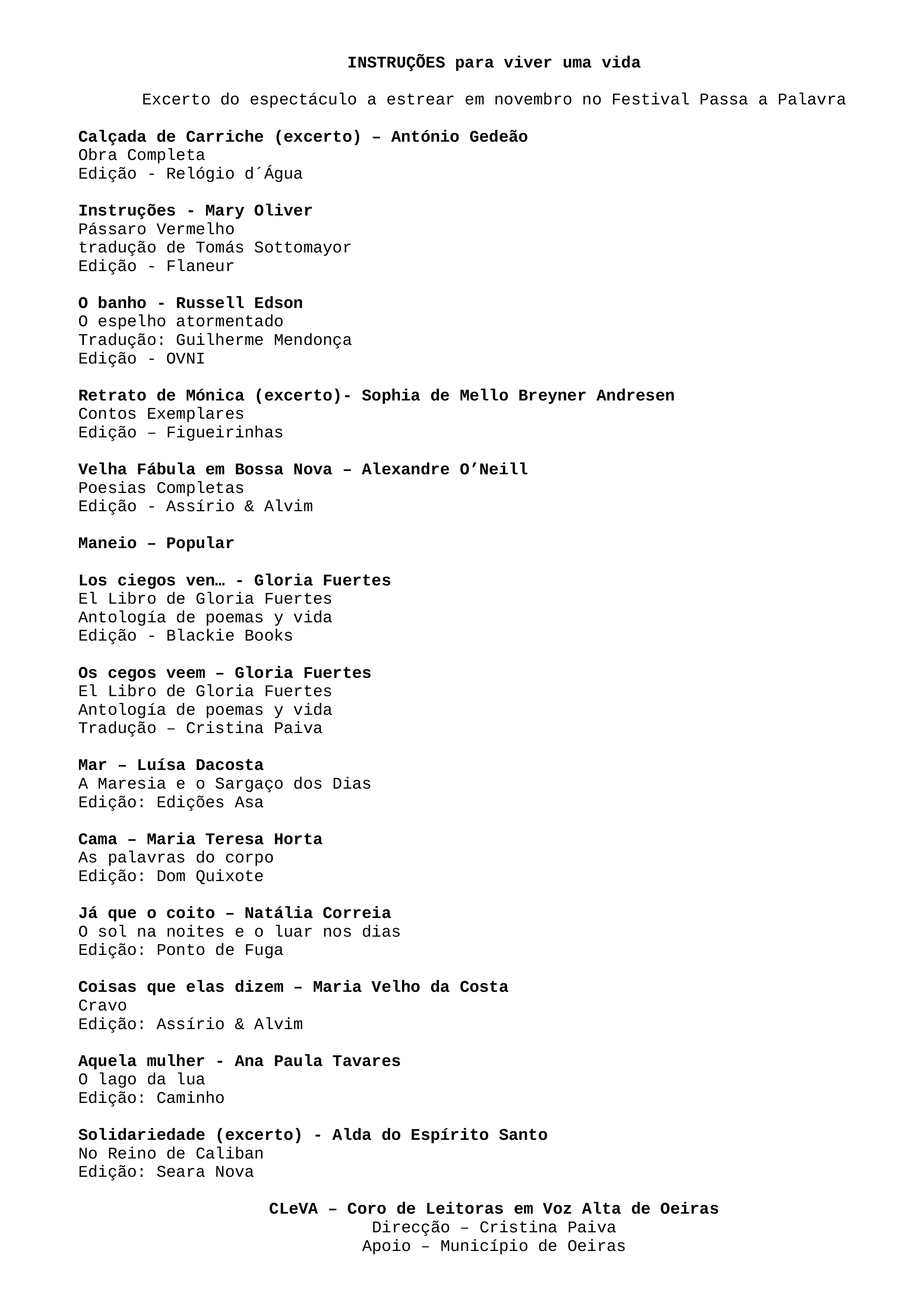Textos ditos por: Ana Bela Mendes, Ana Maria Banha, Ana Maria Barbosa, Ana Maria Vieira, Ana Mota Liz, Ana Pimentel, Cristina Antunes, Elizabete Silva, Guiomar Palmeiro, Irene Cardona, Lúcia Faria, Luísa Alves, Manuela Leitão, Margarida Branco, Margarida Coelho, Margarida Monteiro, Maria João Catalão, Maria José Alves, Maria Prazeres, Sandra Garcia, Sofia Felix, Sofia Soares, Susana Serrano e Vera Nunes.